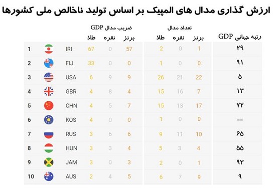 شرکت گوگل در سایت landing.google.com/altmedaltable بر اساس شاخص‌هایی همچون جمعیت؛ علاقه به المپیک و... مدال‌های کسب‌شده در المپیک ریو را ارزش‌گذاری کرده است. دریکی از این شاخص‌ها مدال‌های کسب‌شده توسط کشورها بر اساس تولید ناخالص داخلی یا همان GDP ارزش‌گذاری شده است. در نگاه اول ایران در رتبه نخست این جدول قرار دارد. حالا ما باید از این صدرنشینی خوشحال باشیم؟ درواقع ما موفق‌ترین کشور بر اساس درآمد کشورمان معرفی‌شده‌ایم. به عبارت ساده‌تر با کسب تنها دو مدال طلا موفق‌ترین کشور فقیر دنیا تلقی شدیم؛ اما برخی آمارها نشان می‌داد که ایرانی‌ها آن‌قدرها هم وضعشان در تولید ناخالص ملی نامناسب نیست.