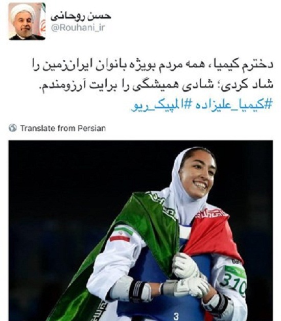 رییس جمهور کشورمان در توییتر خود به تقدیر از کیمیا علیزاده پرداخت.