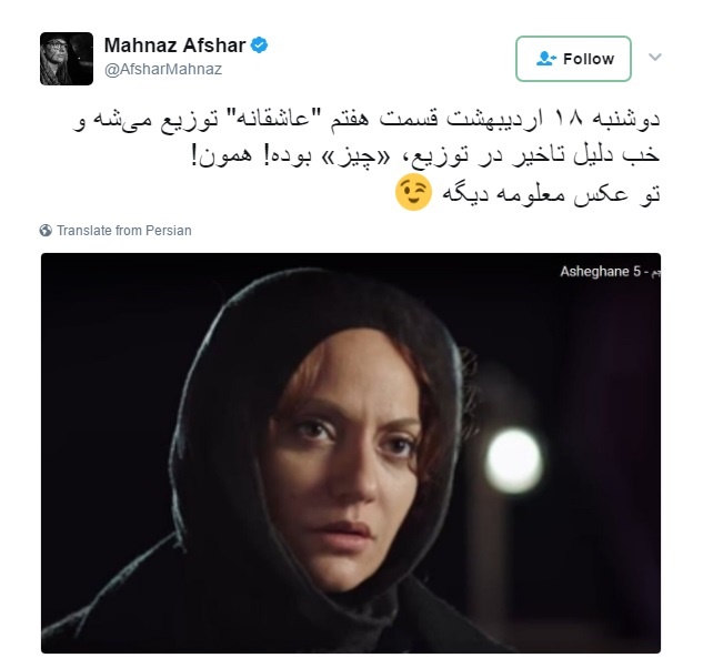 مهناز افشار در توییتر نوشت: «دوشنبه ۱۸ اردیبهشت قسمت هفتم «عاشقانه» توزیع میشه و خب دلیل تاخیر در توزیع، «چیز» بوده! همون! تو عکس معلومه دیگه»