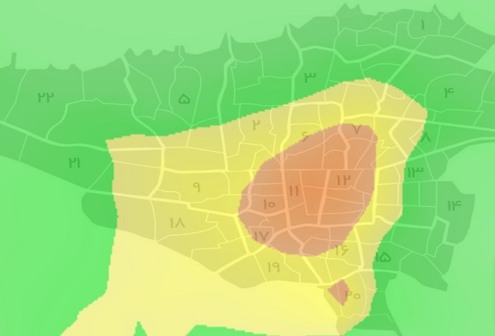 در نقشه زیر مناطق آلوده تهران در ظهر امروز را می‌بینید؛ نارنجی مناطقی است که هوا برای گروه‌های حساس ناسالم است و ظهر هوای سالم را نشان می‌دهد. سبز هم هوای پاک را.
