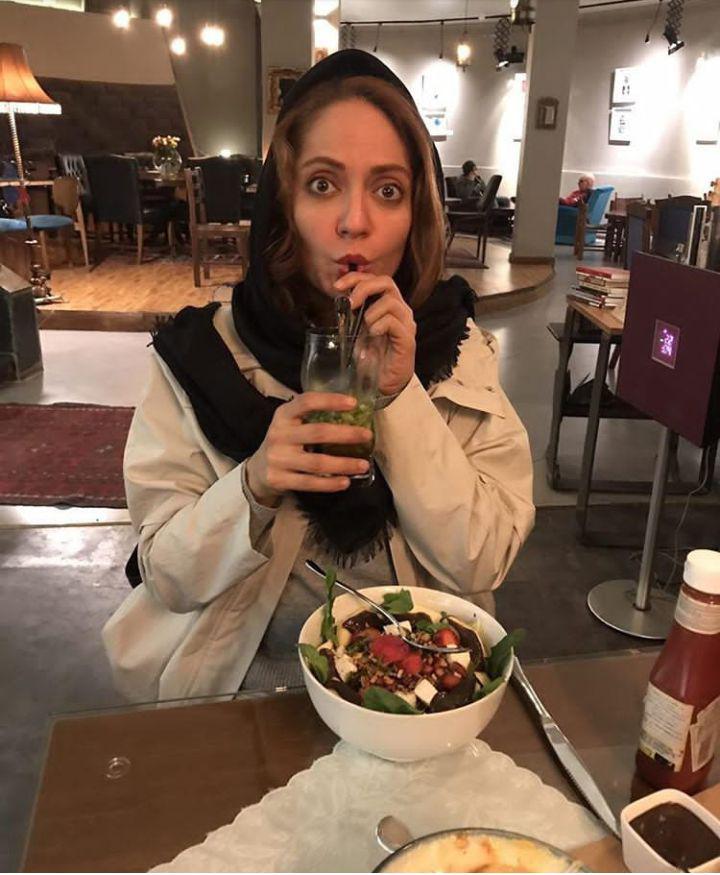 ژست جالب مهناز افشار هنگام خوردن نوشیدنی در کافه + عکس