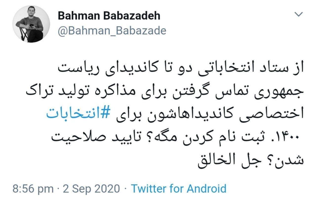 بهمن بابازاده در شبکه اجتماعی خود نوشت:از ستاد انتخاباتی دو تا کاندیدای ریاست جمهوری تماس گرفتن برای مذاکره تولید تراک اختصاصی کاندیداهاشون برای انتخابات ۱۴۰۰.