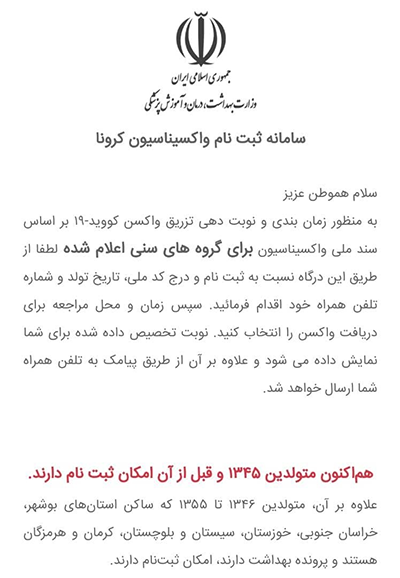 روزنو، متولدین سال ۱۳۴۵ و ماقبل آن می‌توانند با مراجعه به سایت salamat.gov.ir و انتخاب استان و ثبت اطلاعات لازم نسبت به ثبت نام اقدام کرده و در نوبت دریافت واکسن کرونا قرار گیرند.