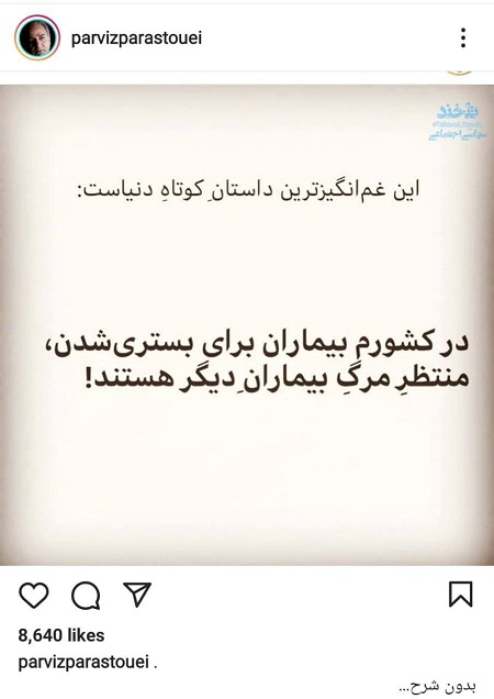 روزنو :پرویز پرستویی، بازیگر مطرح سینما و تلویزیون با انتشار پستی تامل‌برانگیز به فاجعه این‌روز‌های کرونا در کشور پرداخته است.
