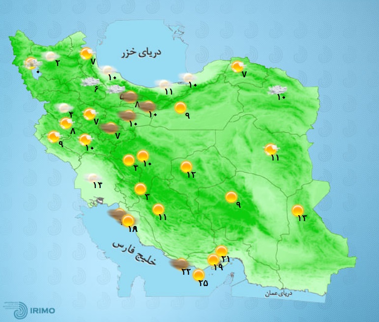 رئیس مرکز ملی پیش‌بینی و مدیریت بحران مخاطرات وضع هوا درباره وضعیت جوی تهران طی دو روز آینده اظهارکرد: آسمان تهران فردا (۲۳دی‌ماه) نیمه ابری و اواخر وقت ابری و بارش پراکنده با حداقل دمای ۵ و حداکثر دمای۱۵ درجه سانتیگراد و طی روز جمعه (۲۴دی‌ماه) ابری و مه رقیق در بعضی ساعت‌ها وزش باد و بارش باران با حداقل دمای۳ و حداکثر دمای ۱۰ درجه سانتیگراد پیش‌بینی می‌شود.