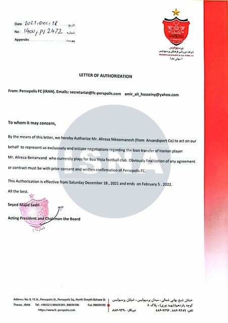 در نامه اول که در تاریخ ۱۸ دسامبر ۲۰۲۱ (۲۷ آذر ۱۴۰۰) به امضای سید مجید صدری (سرپرست وقت باشگاه پرسپولیس) رسیده، این باشگاه به یک مدیر برنامه اجازه می‌دهد تا به نمایندگی از پرسپولیس اقدام به مذاکره برای انتقال قرضی بیرانوند از باشگاه بواویشتای پرتغال به پرسپولیس کند.