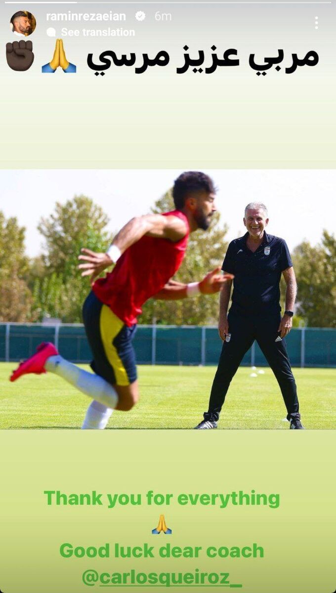 اکنون رامین رضاییان با انتشار تصویری از کیروش و گذاشتن یک پیام در این عکس از زحمات سرمربی پرتغالی قدردانی کرد و نوشت: «ممنون برای همه چیز... موفق باشی سرمربی عزیز».