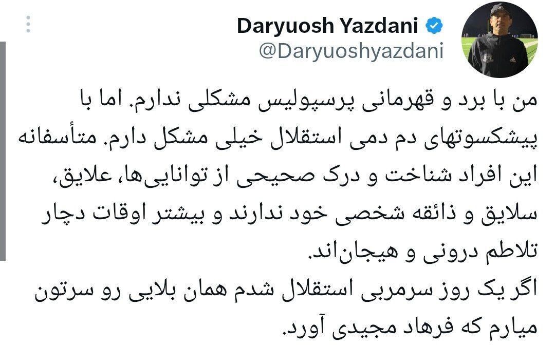 داریوش یزدانی پیشکسوت باشگاه استقلال در توئیتی به بعضی از پیشکسوتان این باشگاه کنایه زد و نوشت: