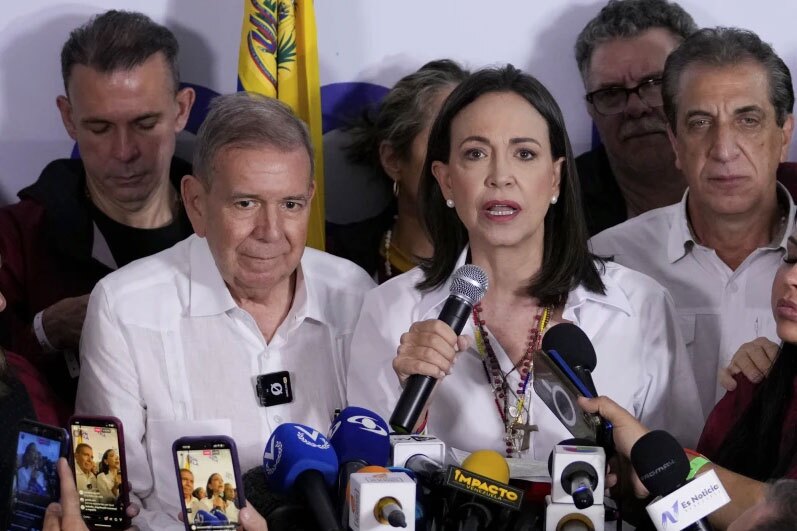 نشست خبری "ادموندو گونزالس" ( فرد سمت چپ تصویر) نامزد اصلی اپوزیسیون ونزوئلا دقایقی بعد از اعلام نتایج اولیه انتخابات/ آسوشیتدپرس