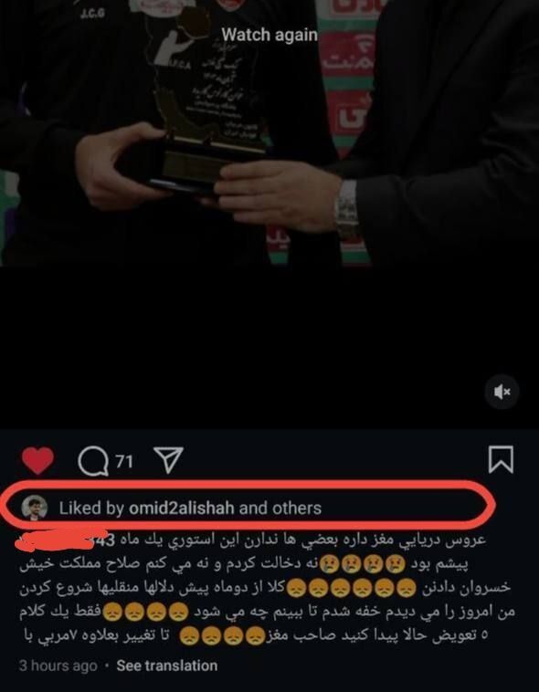 موضوع زمانی جالب تر می شود که گویا امید عالیشاه کاپیتان پرسپولیس از پست انتقادی امروز این هوادار، از نقد او حمایت کرده و این پست را لایک کرده است. اگرچه او دقایقی بعد لایک خود را از زیر پست برداشت اما اسکرین شات لایک او در فضای مجازی دست به دست می چرخد تا این ذهنیت ایجاد شود که احتمالا کاپیتان سرخ ها در جریان متن نوشته نبوده و از روی عادت از این مطلب منتقدانه حمایت کرده است. هرچند که اگر واقعا عالیشاه این متن را لایک کرده باشد و ادعایی در مورد فتوشاپ و این ترفندها صورت نگیرد بی شک این موضع گیری علیه سرمربی تیم می تواند محل بحث فراوان شده و حاشیه و جنجال های زیادی را ایجاد کند.