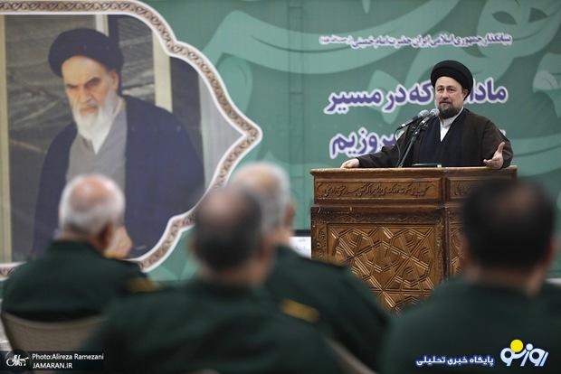 سید حسن خمینی تأکید کرد: دنیا همان‌ دنیای تیمور و چنگیز است؛ به هیچ عهد، وفا، پیمان و دلسوزی نمی‌شود پایبند شد. اگر قدرت‌ و توانایی خودمان‌ نباشد، همیشه زیر سمّ اسب‌هایشان بوده‌ایم و از این به بعد زیر چرخ تانک‌هایشان خواهیم بود. توانایی عظیمی که امام در روح مردم‌ ایران دمید که یکی از نمادهایش تشکیل سپاه است، باید به ترس‌ دشمنان خدا منجر شود.