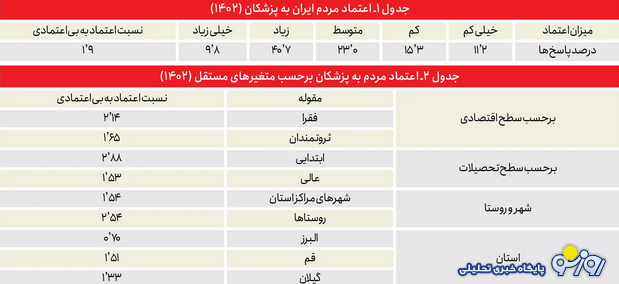 جایگاه پزشکان از حیث اعتماد اجتماعی در جامعه ایران، همچنان یکی از بالاترین جایگاههاست. آخرین پیمایش ارزشها و نگرشهای ایرانیان که در پاییز ۱۴۰۲ انجام شد نشان میدهد، نسبت افرادی که به پزشکان اعتماد زیاد و خیلی زیاد دارند، به کسانی که اعتماد کم و خیلی کم دارند، ۱٫۹ برابر است. (نمونه آماری ۱۵۸۷۲ نفر)