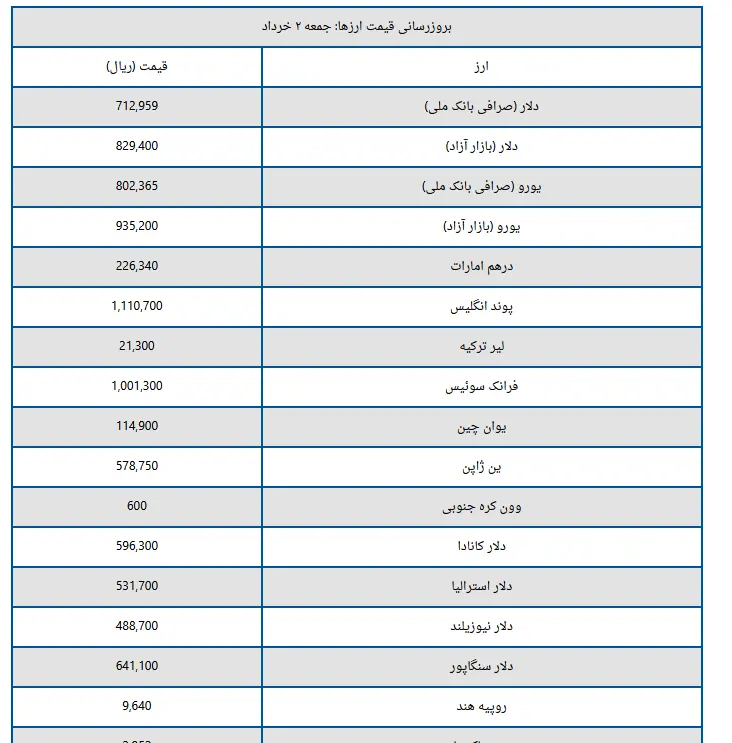 قیمت دلار، یورو، پوند و سایر ارزها امروز جمعه ۲ خرداد را میتوانید در جدول زیر مشاهده نمایید. لازم به ذکر است که این نرخها قیمت بازار آزاد است (بجز دلار که نرخ بازار مبادله ارزی است) و با نرخ ارز سهمیهای متفاوت است.