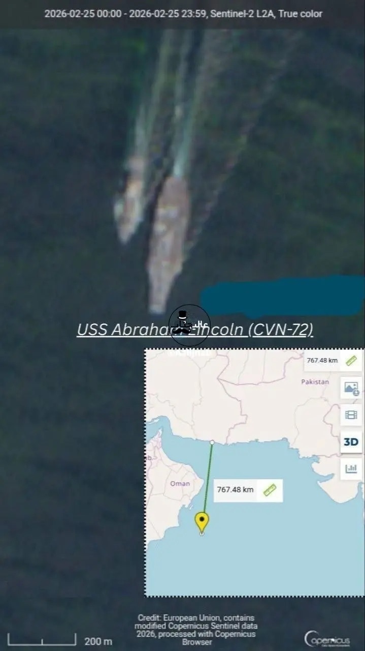 تصاویری از ناو هواپیمابر آبراهام لینکلن در فاصله‌ی ۷۸۰ کیلومتری چابهار را در ادامه مشاهده می‌کنید.