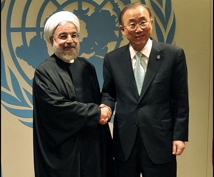 بان کی مون دبیر کل سازمان ملل متحد نیز در این دیدار با اشاره به اینکه میزبانی رییس جمهوری ایران، افتخار بزرگی است، به بحران هایی که امنیت و ثبات جهان را به مخاطره انداخته اشاره کرد و گفت: من در بحث هسته ای، تعامل مفید ایران با آژانس بین المللی انرژی اتمی و مشارکت فعال در مذاکرات با 1+5 را ستایش می کنم.